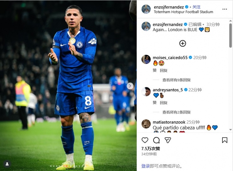 恩佐上传了自己在比赛中的照片,并配文写道:“再一次……伦敦是蓝色的????”。