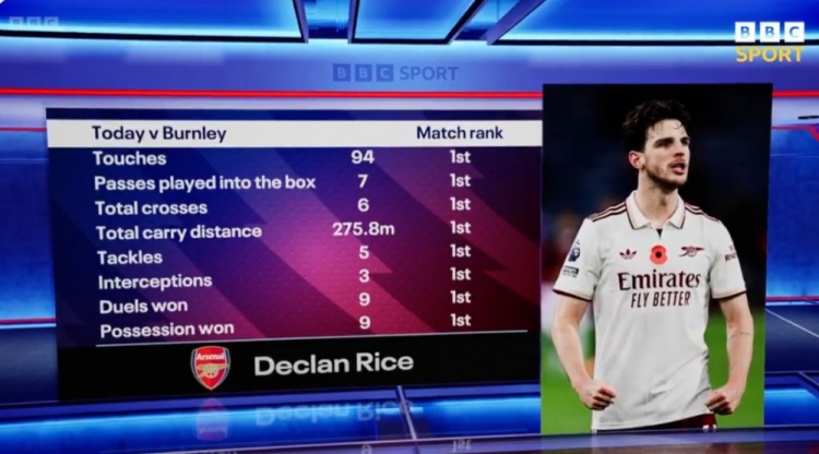 零点吧足球11月2日讯 英超第10轮比赛,赖斯破门,阿森纳客场2-0击败伯恩利,据BBC统计,此役赖斯触球、抢断、拦截等多项数据全场居首。