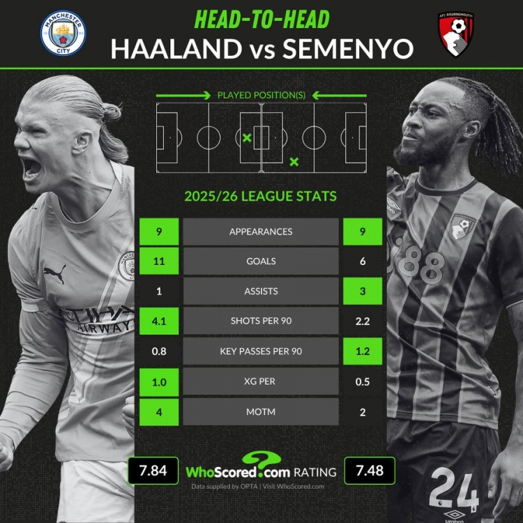 零点吧足球11月3日讯 本轮英超,曼城将主场对阵伯恩茅斯。赛前WhoScored列出了两队主要得分手哈兰德和塞梅尼奥的数据对比。