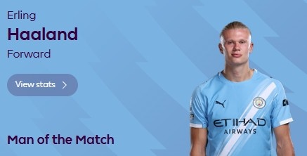 零点吧足球11月3日讯 2025-26赛季英超第10轮,曼城主场3-1伯恩茅斯。哈兰德首发出战,贡献双响,赛后当选英超联赛官方本场最佳球员。