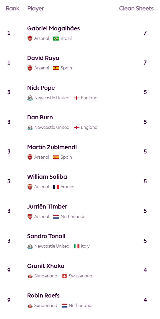 5次:波普(纽卡)、丹-伯恩(纽卡)、苏维门迪(阿森纳)、萨利巴(阿森纳)、廷伯(阿森纳)、托纳利(纽卡)