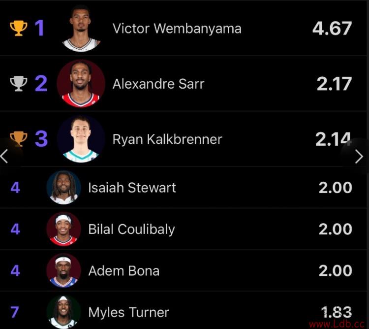 场均封盖榜上,第二名萨尔约为2.2次。而总封盖数上,文班6场比赛28次、第二名的卡尔克布伦纳7场15次。