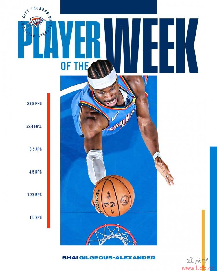 亚历山大上周率领雷霆取得4胜0负的战绩,场均拿下28.8分4.5篮板6.5助攻。