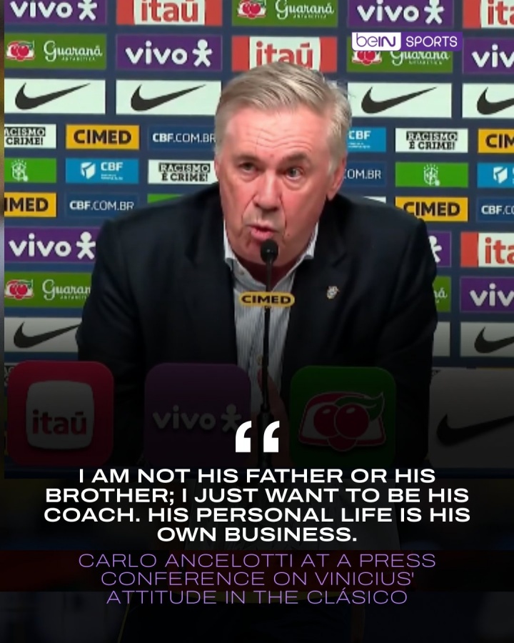 随后安切洛蒂还谈到维尼修斯的私生活,他表示:“我不是他爸也不是他哥,我只想做他的教练,仅此而已。他的私生活是他自己的事。”