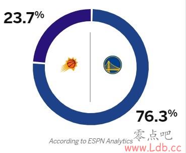 ESPN预测本场胜率,主场作战的勇士被大幅看好,胜率76.3%,太阳只有23.7%。