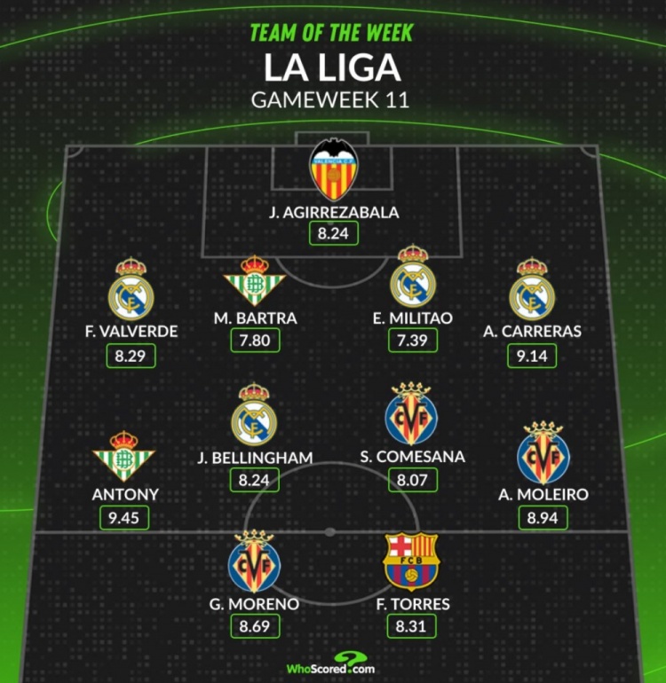 西甲本周最佳阵容公布:安东尼以9.45高分领衔,皇马4将入选