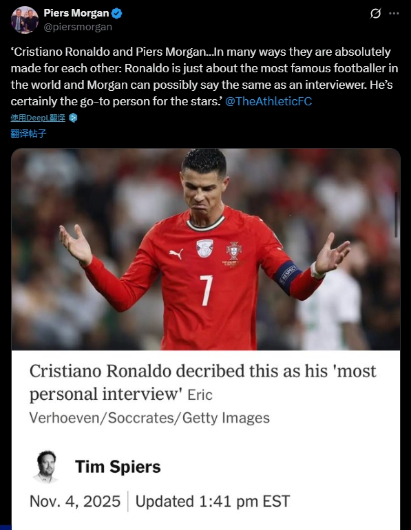 零点吧足球11月05日讯 近日C罗接受了英国主持人摩根的专访,刚刚摩根更新社媒,晒出The Athletic对采访的报道。