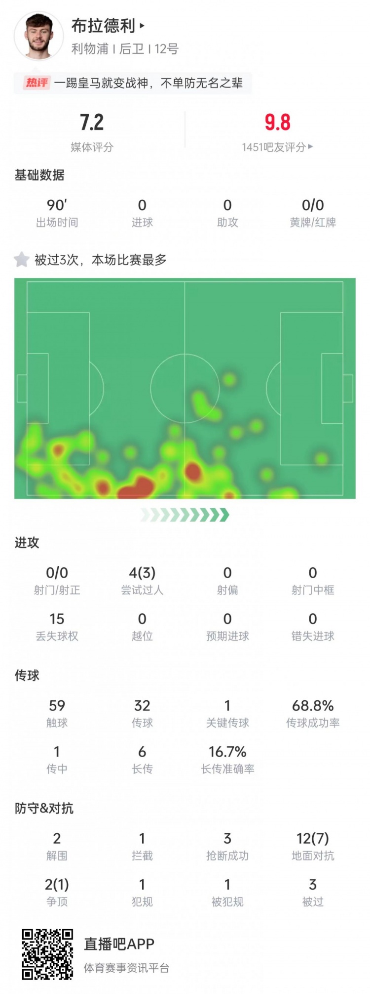 此役布拉德利为利物浦踢满全场,4次过人3次成功,贡献2次解围、1次拦截、3次抢断,利物浦官方宣布,他当选本场比赛利物浦队内最佳球员。