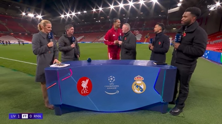 赛后,利物浦队长范戴克在场边接受了媒体TNT的瞬采,与鲁尼、沃尔科特等评论员聊了一会儿。