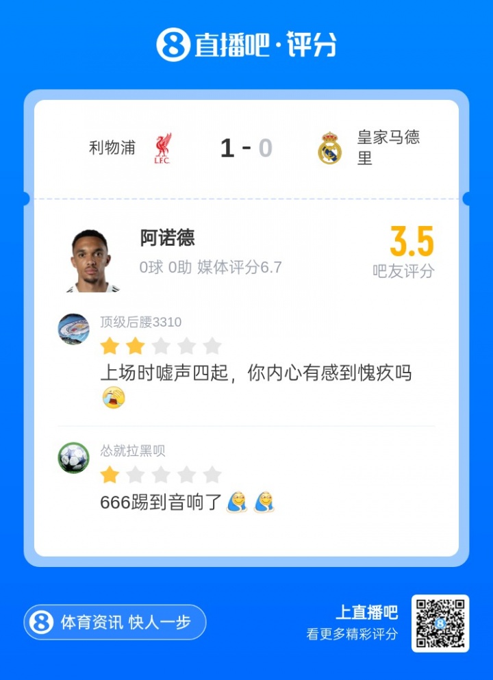 本场比赛,出身于利物浦青训,今夏加盟皇马的阿诺德于第81分钟替补登场,但并未改变比赛走势,范戴克率领的利物浦最终还是在主场取得了胜利。