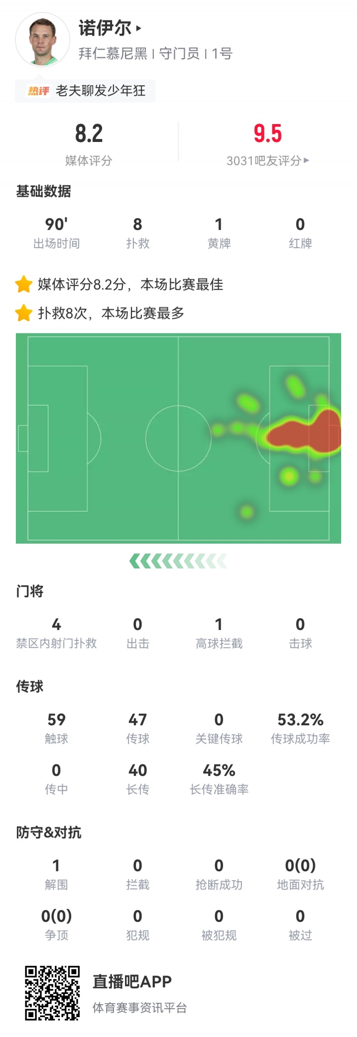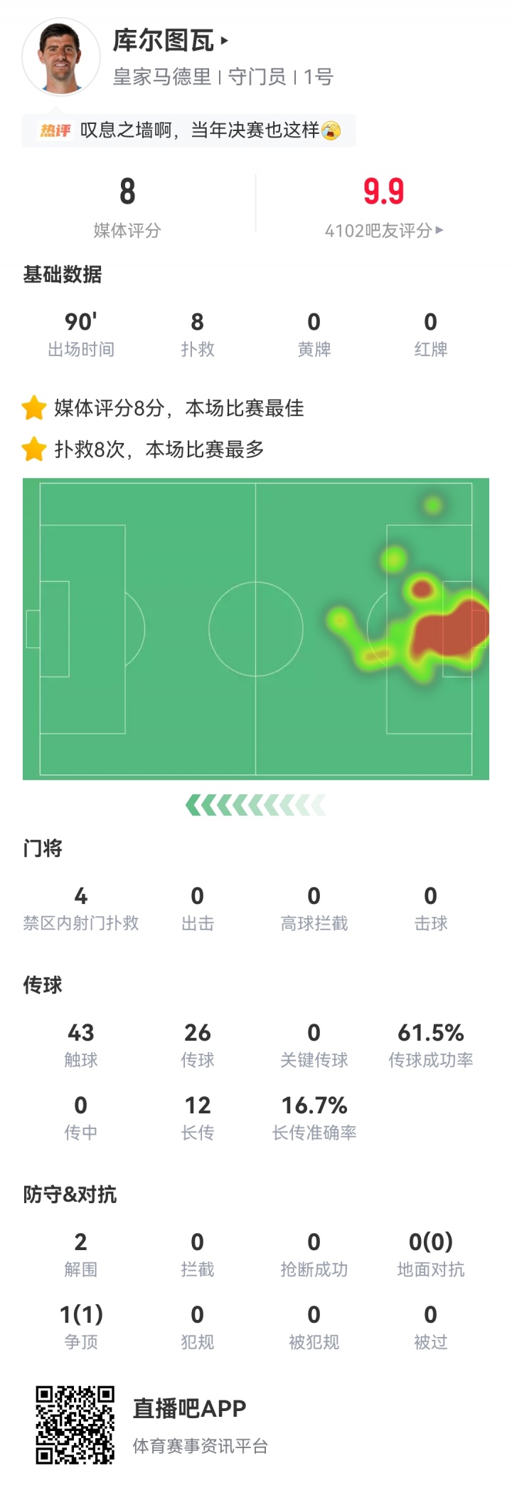 赛后评分机构Sofascore晒出了两位门将的评分,诺伊尔8.2分,库尔图瓦8.0分。