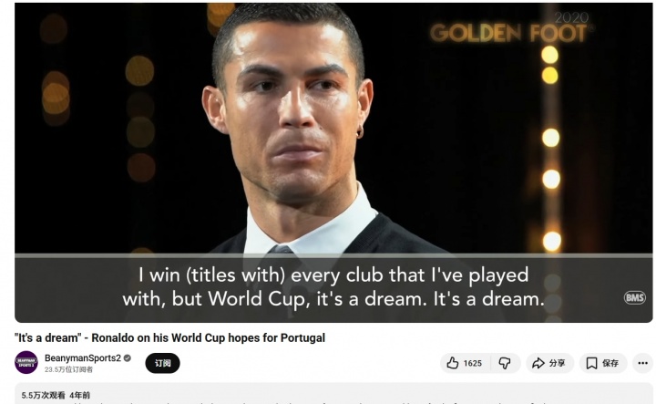 不过,C罗近年来多次采访都表示为葡萄牙赢得世界杯是自己最大梦想。