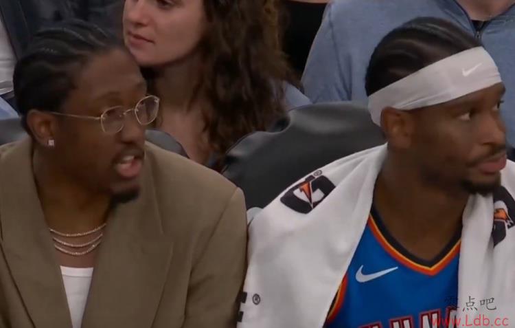 比赛最后时刻,镜头给到板凳席上的雷霆众将,亚历山大和仍在养伤的杰伦-威廉姆斯神同步。