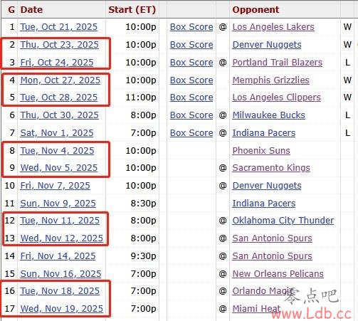 赛季初勇士的赛程堪称魔鬼,在11月19日前他们一共要在17场比赛中打5组背靠背!而联盟同期其它球队最多是3组!