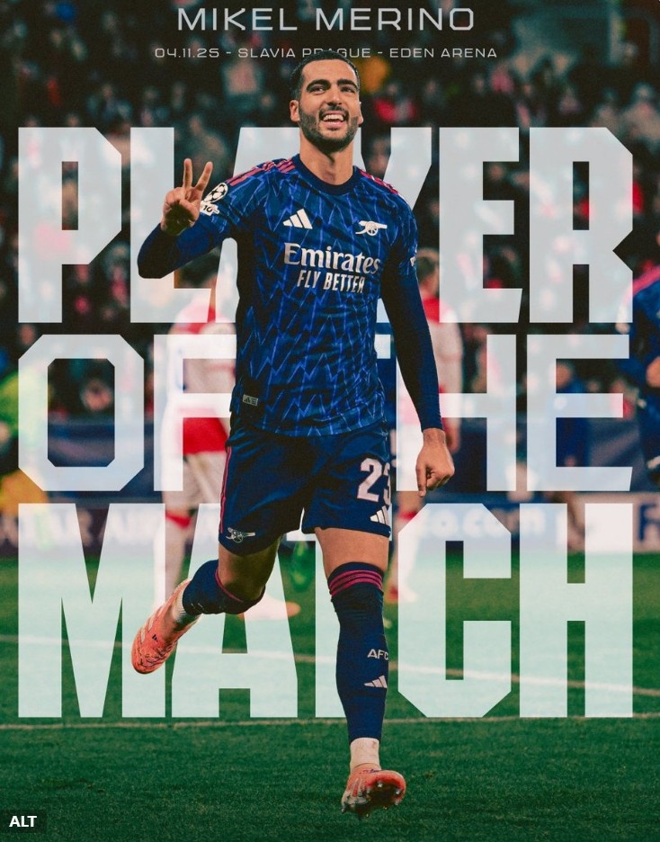 客串中锋梅开二度,阿森纳官方:梅里诺当选本轮欧冠队内最佳球员