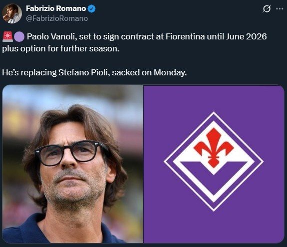 罗马诺表示:“瓦诺利即将与佛罗伦萨签约,合同期限至2026年,含延长一年的条款。他将取代周一被解雇的皮奥利,成为紫百合新帅。”