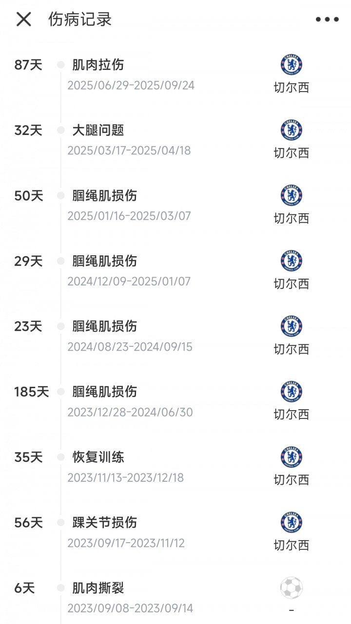 21岁拉维亚自2023年8月18日加盟切尔西以来,一共受伤9次,总天数累计503天,错过了77场比赛,2年多以来合计只为切尔西出战30场比赛,0球1助。他的伤情主要是腘绳肌和拉伤。