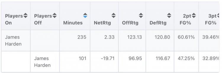 当哈登下场时,快船净效率-19.7,进攻效率97,防守效率116.7。