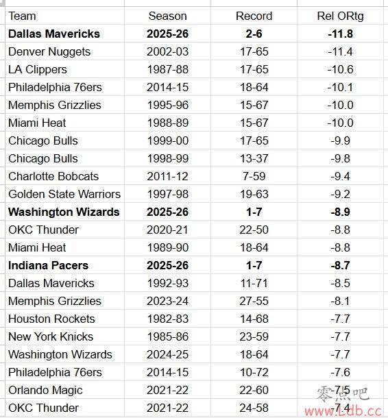 零点吧11月7日讯 据数据网站BBR的数据,本赛季截至目前为止,独行侠的相对进攻效率值为-11.8,联盟历史最差。