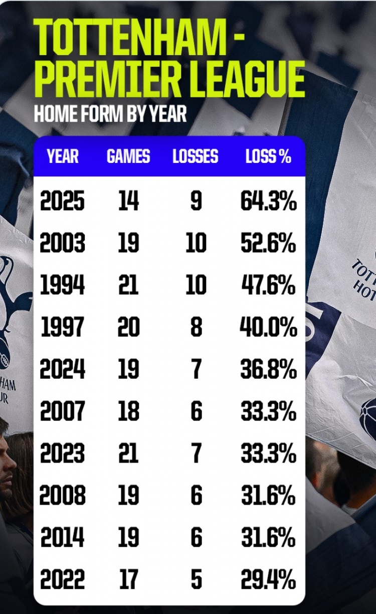 零点吧足球11月7日讯 据Opta统计,热刺今年在主场参加14场英超比赛,输掉其中9场,主场败率64.3%,队史英超自然年输球率最高。