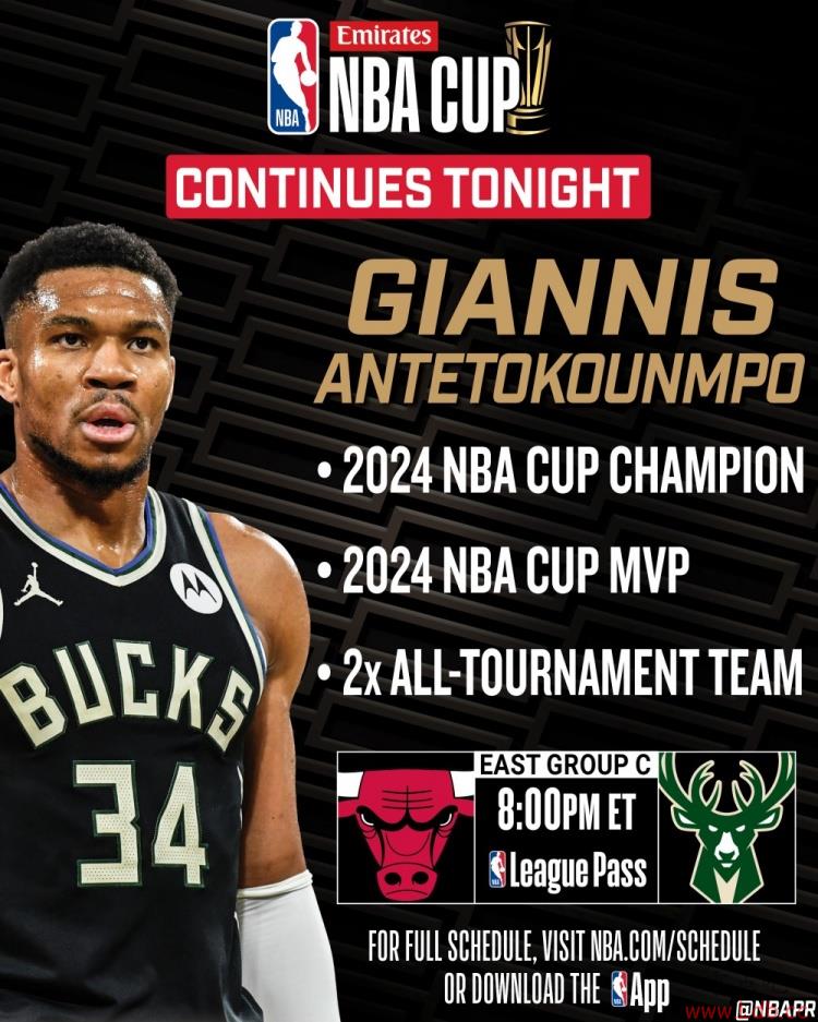零点吧11月8日讯 NBA官方预热NBA杯,卫冕NBA杯冠军雄鹿今天将开始卫冕之旅,他们将在小组赛首战对阵芝加哥公牛。