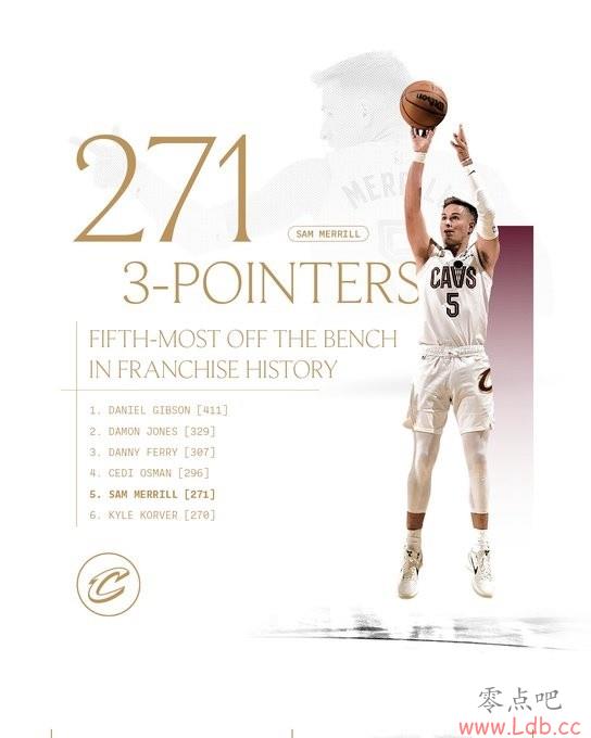 零点吧11月8日讯 骑士官方发布纪录,梅里尔以替补身份命中率271记三分,超越科沃尔排名骑士队史第五。