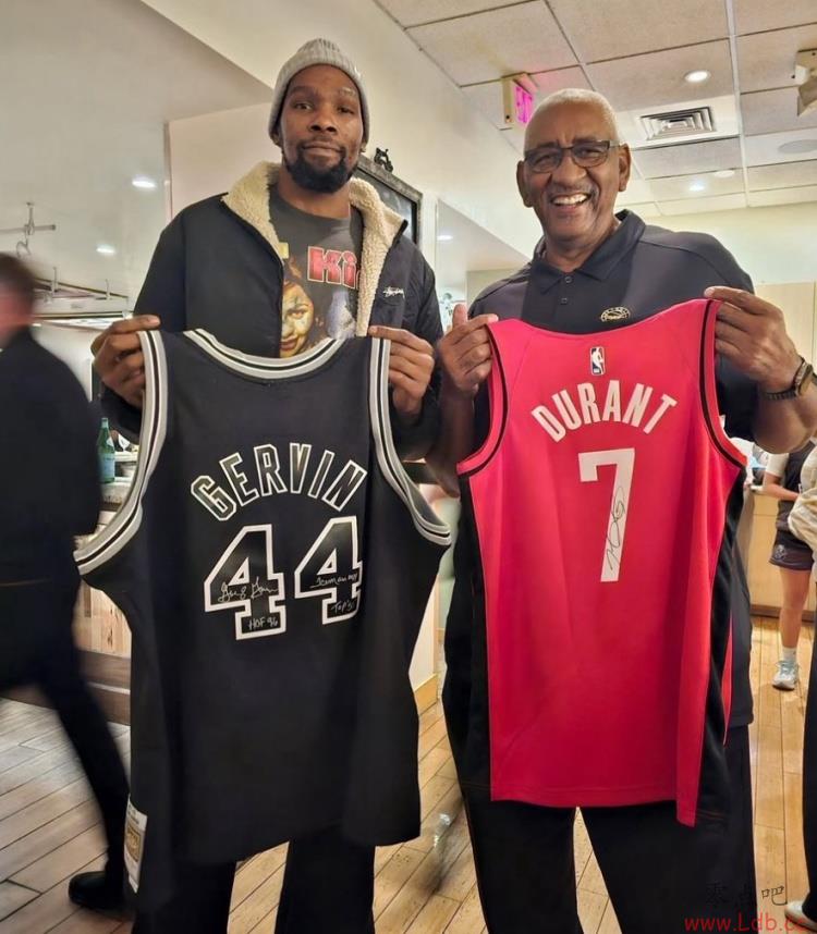 赛前,杜兰特和马刺名宿“冰人”乔治-格文交换球衣。