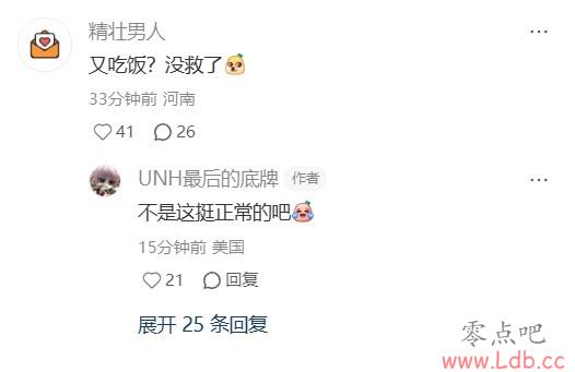 该球迷与网友在评论区互动:吃饭,挺正常的吧。