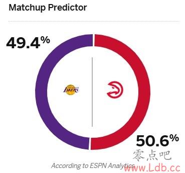 ESPN预测本场比赛胜率,老鹰达到50.6%,仍高于湖人的49.4%。