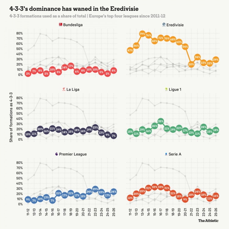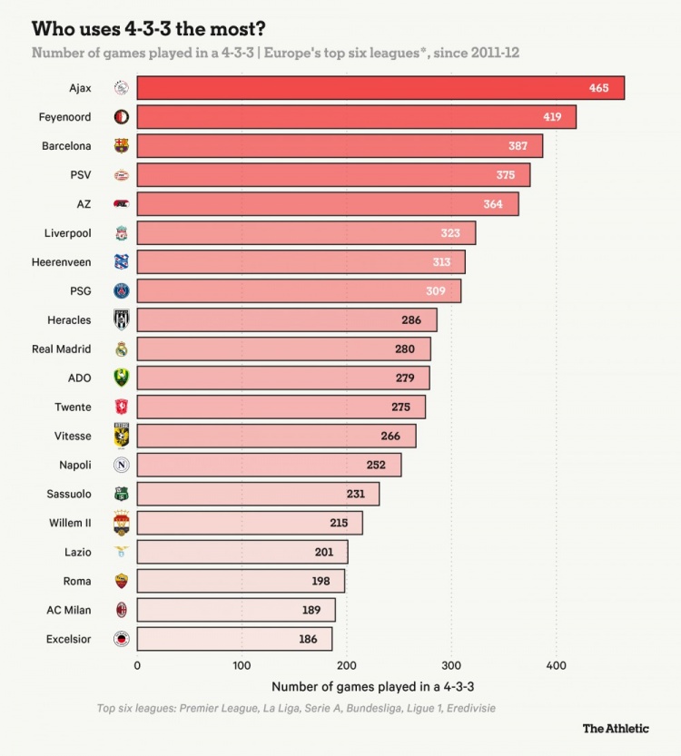 尽管逐场阵型统计在2010年代才出现,这份现代数据却为观察4-3-3阵型提供了绝佳视角。下图显示自11/12赛季以来,欧洲六大联赛中使用4-3-3阵型最频繁的球队榜单,“全攻全守”的深远影响一目了然。前20名中荷甲球队占据11席,更惊人的是其中六支球队曾至少一个赛季征战次级联赛(这些场次未计入统计)。