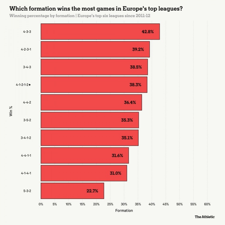毕竟表面来看,4-3-3阵型确实是胜率最高的阵型:自11/12赛季以来,采用该阵型的球队胜率达42.8%,在十大常用阵型中领跑。