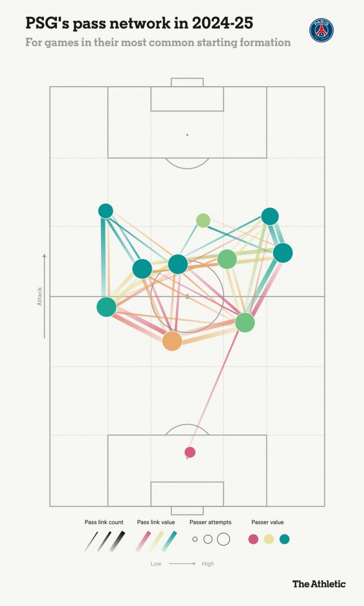 但这份成功更应归功于使用者的水准,巴萨、利物浦、曼城等豪门本身实力超群,而非阵型自带胜利光环。正是在此背景下,巴黎圣日耳曼用4-3-3体系问鼎欧冠。尽管他们上赛季的传球热力图显示,其阵型已远离传统模式——边卫哈基米常化身第四中场。