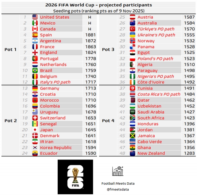 零点吧足球11月09日讯 据外媒Football Meets Data报道,国际足联(FIFA)将改变通过附加赛晋级2026年世界杯的球队分档原则!