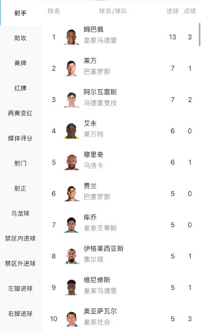 射手榜方面,姆巴佩13球排名第一,莱万、阿尔瓦雷斯7球分居二三位,艾永、穆里奇打进6球排在第四和第五位,费兰、库乔、伊格莱西亚斯、维尼修斯、奥亚萨瓦尔打进5球。