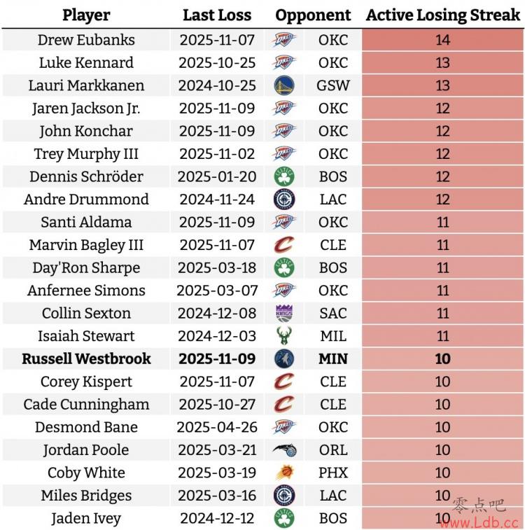 现役球员面对一支球队连败榜 雷霆刷屏 威少面对森林狼10连败