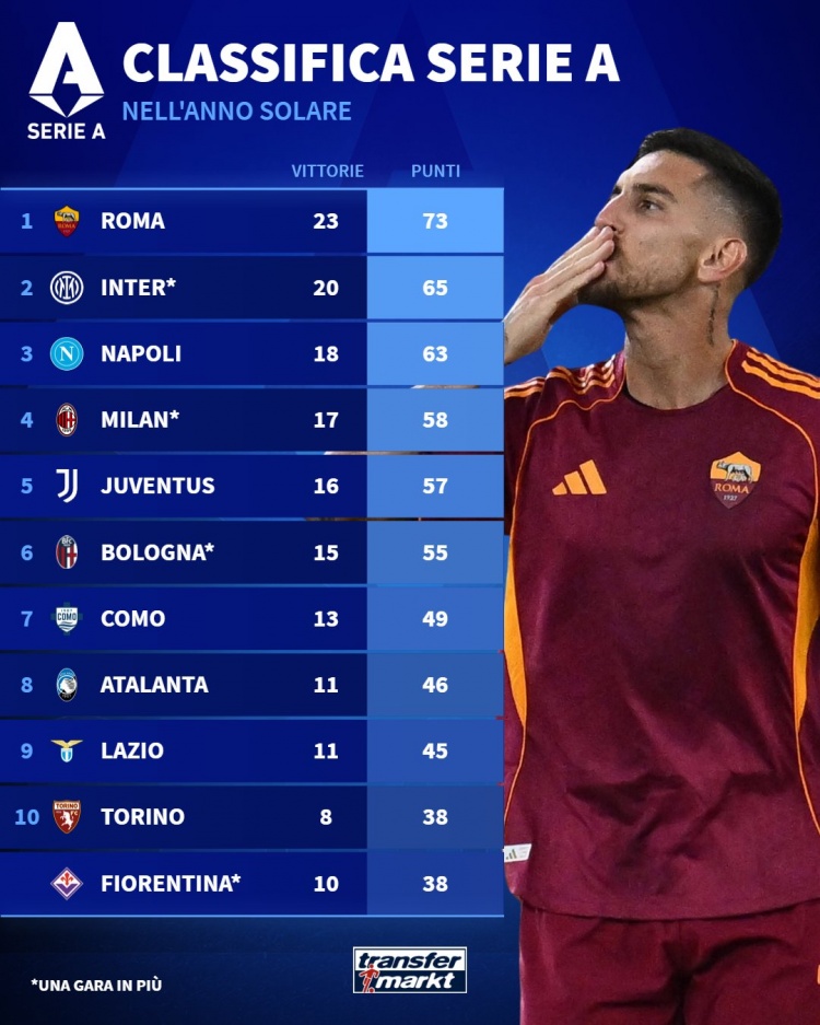 零点吧足球11月10日讯 德国转会市场统计了今年意甲球队拿到的积分,列出2025年意甲积分榜单,罗马73分居首。