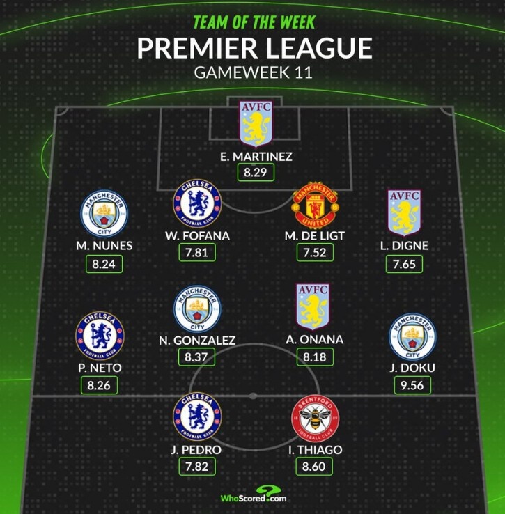 中场:内托(切尔西)、尼科-冈萨雷斯(曼城)、奥纳纳(维拉)、多库(曼城)