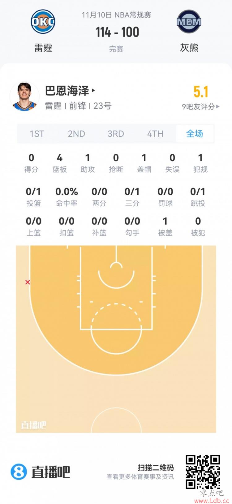 雷霆次轮44号秀布鲁克斯·巴恩海泽 登场7分钟