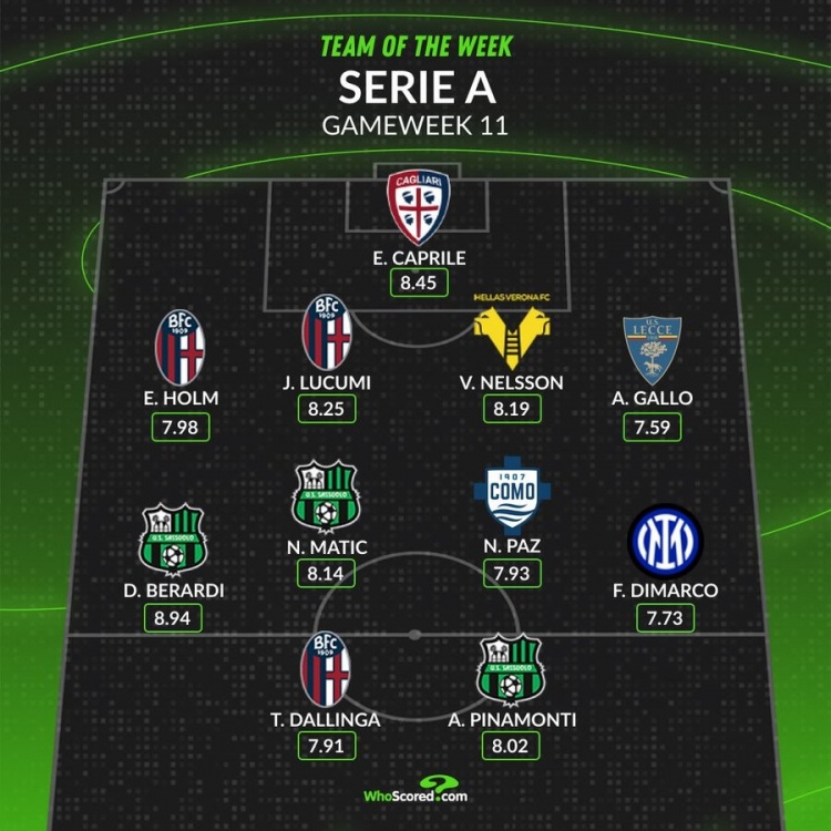 中场:贝拉尔迪(萨索洛,8.94分)、马蒂奇(萨索洛,8.14分)、帕斯(科莫,7.93分)、迪马尔科(国际米兰,7.73分)