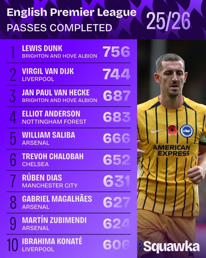 本赛季英超成功传球榜:范戴克第二,中场仅安德森、苏维门迪