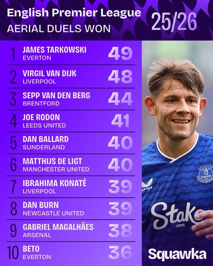 零点吧足球11月11日讯 英超联赛已经进行了11轮,squakwa也统计了本赛季英超空中成功对抗次数,塔科夫斯基力压范戴克居首。