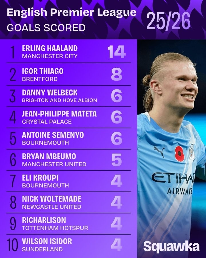 本赛季英超进球榜:哈兰德14球居首,维尔贝克、姆伯莫在列