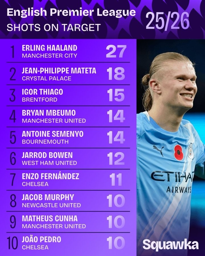 本赛季英超射正榜:哈兰德27次领跑,姆伯莫、恩佐、佩德罗在列