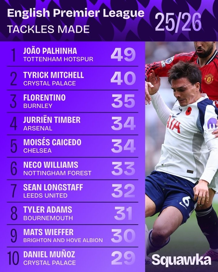 零点吧足球11月11日讯 英超联赛已经进行了11轮,squakwa也统计了本赛季英超抢断次数情况,拜仁外租的帕利尼亚居首。