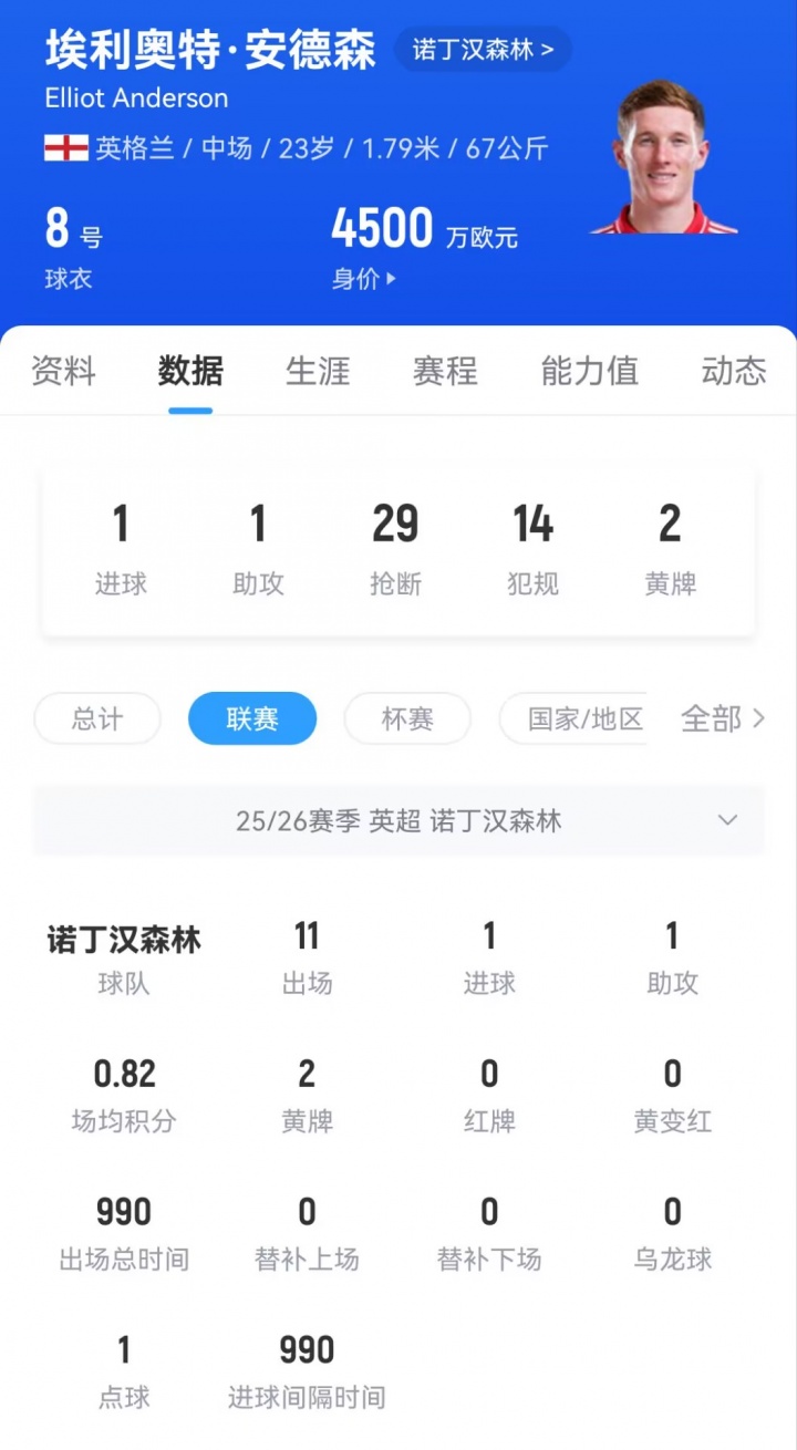 23岁的森林中场埃利奥特·安德森本赛季为森林在联赛已出场11次,贡献1球1助攻。目前他的德转身价为4500万欧元。