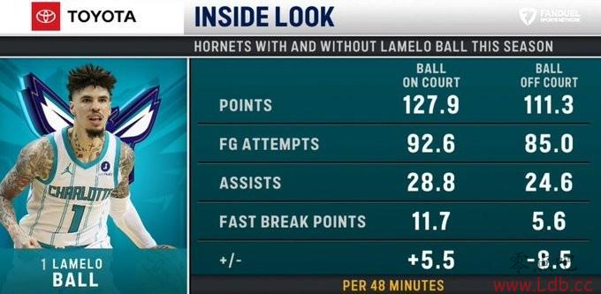 黄蜂自媒体晒出数据,当拉梅洛出站时,黄蜂每48分钟净负8.5分,当他缺阵时,48分钟净胜5.5分。