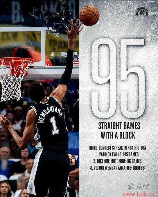 比赛首节,文班亚马送出一次盖帽,目前已经连续95场有盖帽入账,NBA历史第三长,仅次于尤因(145场)和穆托姆博(116场)。