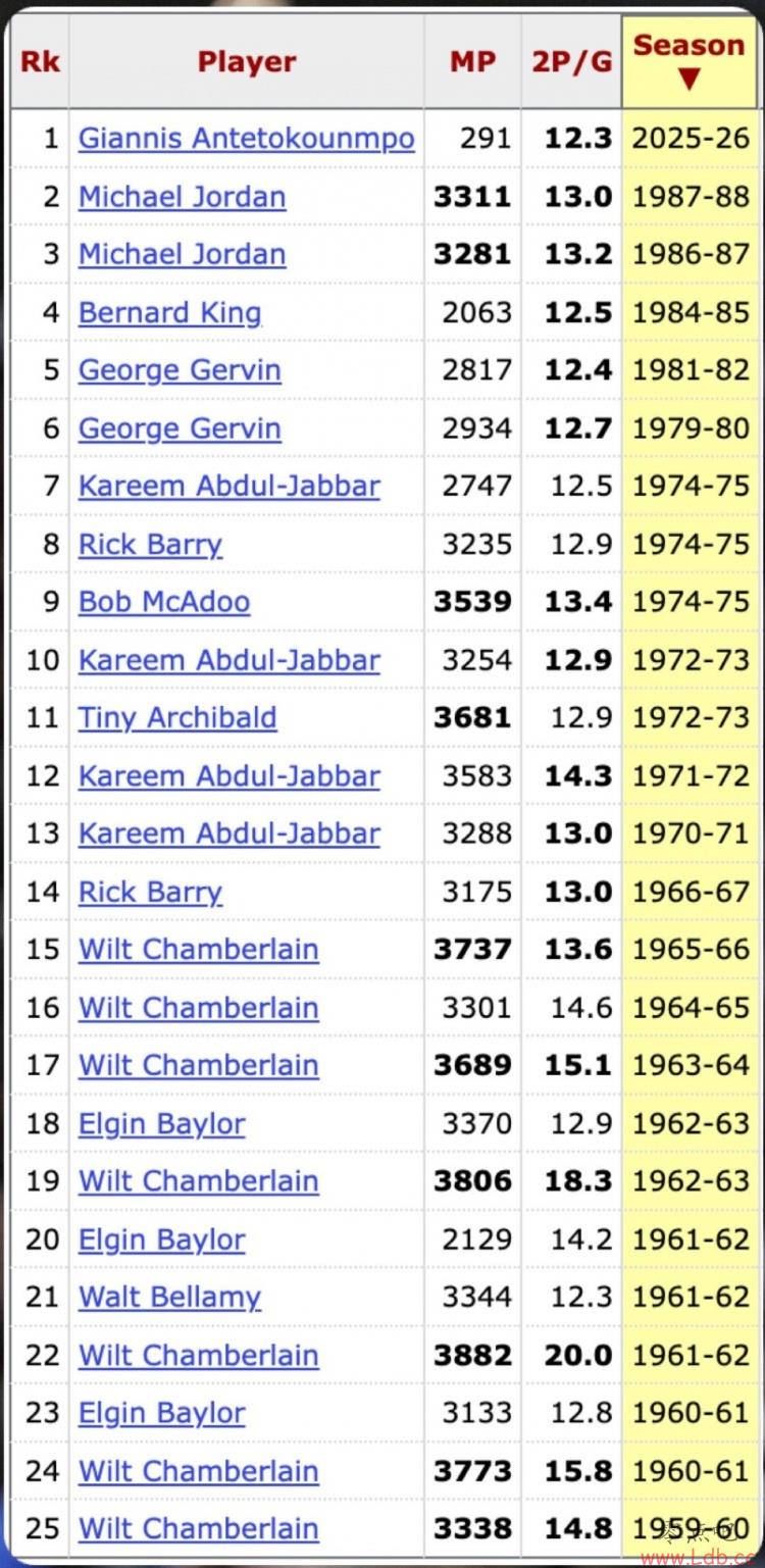 纵观NBA历史,只有25人次单赛季能做到这一点,而最近一次还要追溯到1987-88赛季。值得一提的是,这25次里面,有19次是发生在引入三分线前。