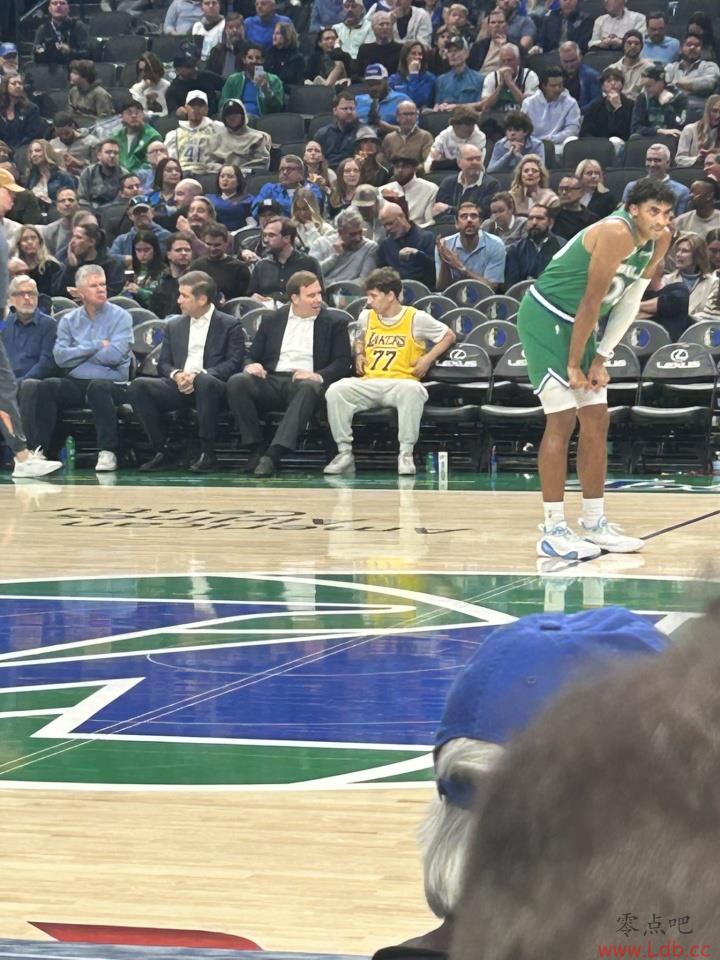 独行侠老板杜蒙和一名身穿湖人77号球衣的球迷在场边进行愉快交谈