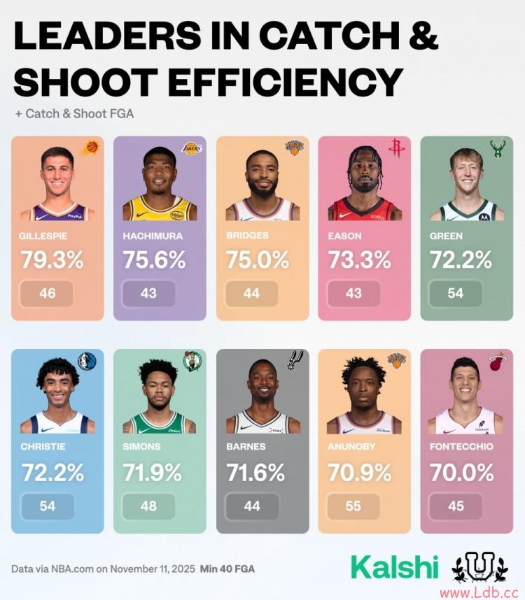 注:至少出手40次接球投篮;有效命中率=(命中数+0.5×三分命中数)/出手数